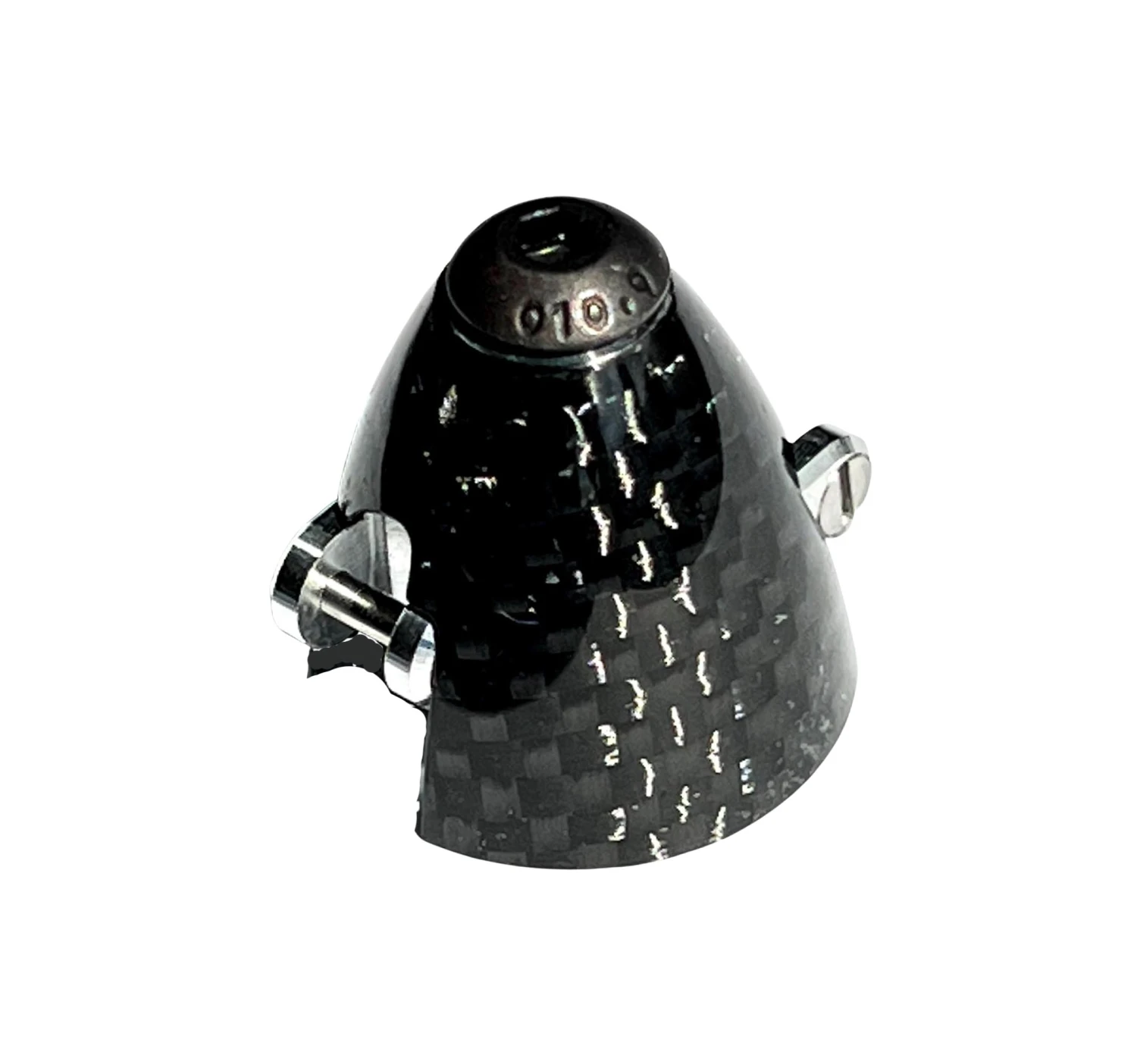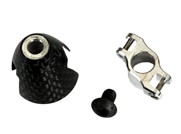 The GM F5K Carbon 25mm Spinner Assembly has a carbon fibre cone and is suitable 5 mm root folding propeller blades with a 2mm hinge pin hole. The spinner assembly consists of a very nicely molded carbon fibre spinner cone, a 7075 alloy CNC yoke (centre piece), two polished steel hinge pins for mounting the prop blades and a hex end conical spinner retaining screw. The end of the hinge pins are threaded for securing them into the yoke. The spinner and prop assembly attach to the motor shaft using a conical split collet (purchased separately) which is clamped to the shaft by tightening the front clamping screw.