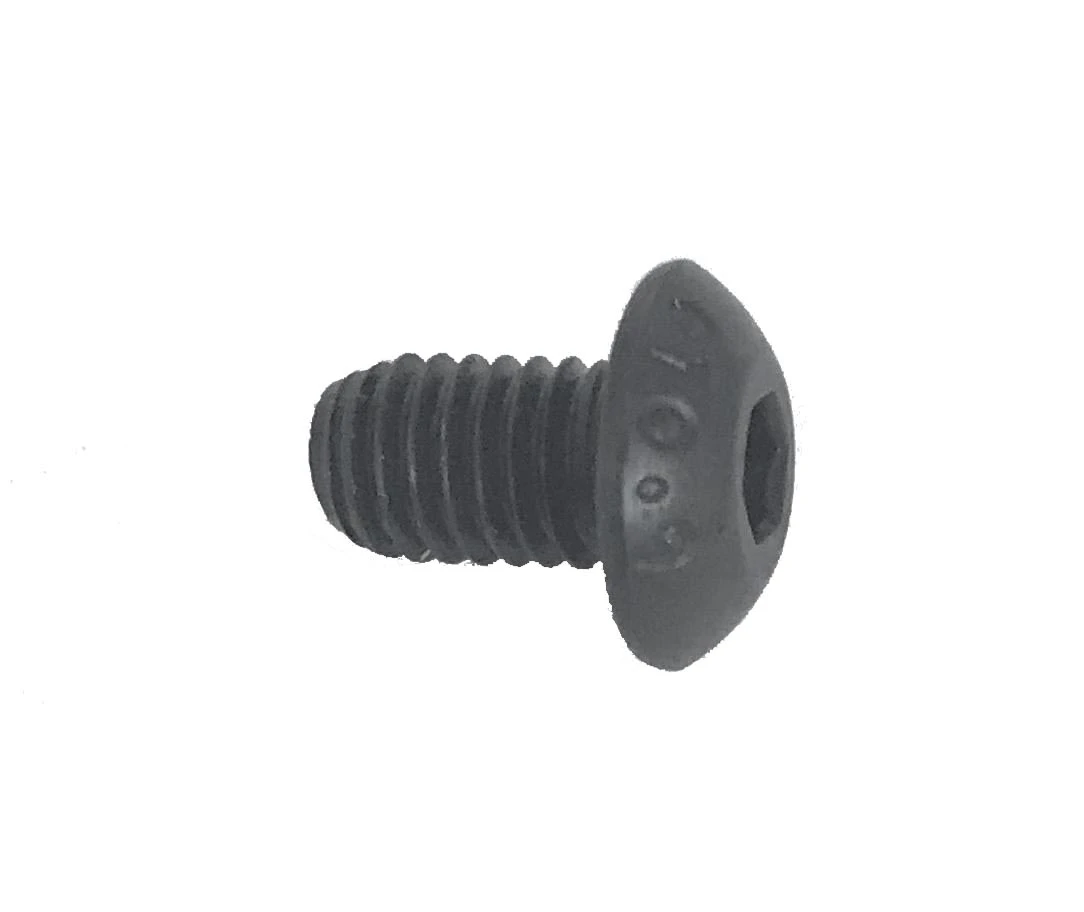 One 8 mm long M5 domed hex end high tensile gunmetal black steel screw.