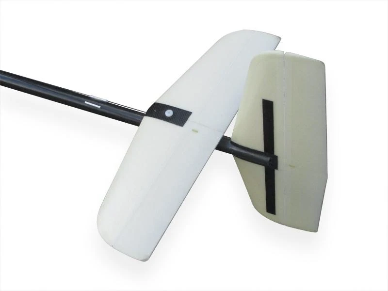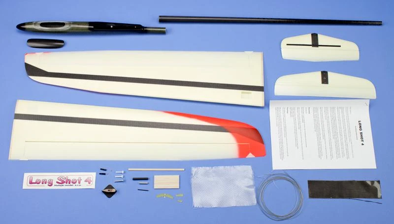 The Longshot 4 DLG is a substantial improvement on the earlier versions, with better aerodynamics and an improved molded glass / foam / glass wing, with lots of carbon in the right places. The Longshotโs fuselage is a carbon/Kevlar molding with a lightweight rolled carbon tailboom that is long (for good stability) and very stiff (for high launches). The R/C is accessed though a handy canopy hatch, and the wings are bolted onto the low pod, keeping the frontal area to a minimum. The tail is ready finished in blue foam with lightweight glass skin. The tailplane is conveniently removable for no fuss transportation. It is mounted on a nicely prefabricated carbon pylon that is glued to the boom. The Longshotโs very smooth low drag wing is supplied in two pieces and is easily joined using the supplied carbon reinforcements, and is painted with flashes of colour on the tips. The strong carbon spar ensures the model can be safely launched to 50m, giving dead air times of over a minute. All the linkages are provided, only glue and the RC gear needs to be supplied by the builder.